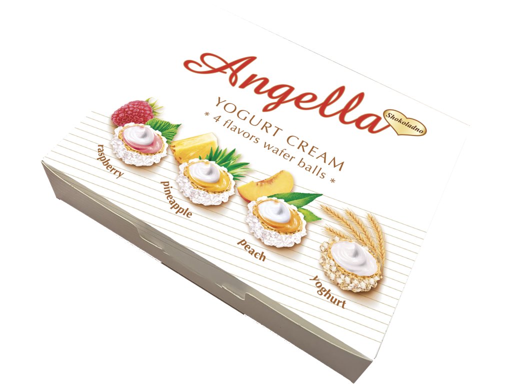 Bonbóny s cukrářskou polevou a příchutí jogurtového krému v kombinaci s malinami, ananasu a broskve.