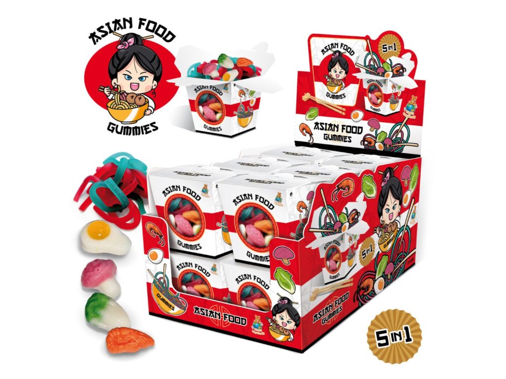 Zábavné gumové želé jako asijské jídlo s ovocnou příchutí. Uvnitř najdete: sushi, nudle, vajíčka či mořské plody.