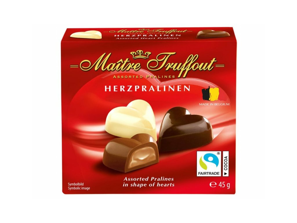 Belgické srdíčka od Maitre Truffout jsou exkluzivní mini pralinky s náplní, které spojují mléčnou čokoládu, bílou čokoládu a tmavou čokoládu. Vhodné jako dárek k Valentýnu nebo jen tak pro radost.