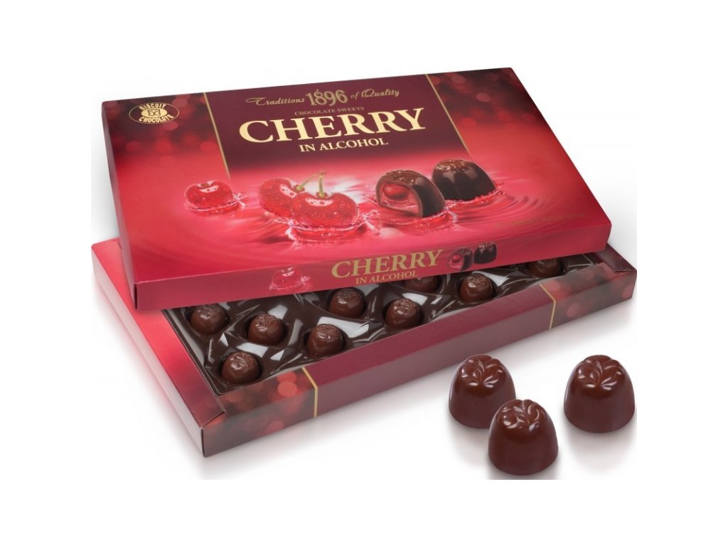 čokoládová hmota (granulovaný cukr, kakaový likér, kakaové máslo, emulgátor (sójový lecitin), aroma (vanilka)), granulovaný cukr, třešně extrahované v alkoholu (9.7%), škrobová melasa, tinktura z třešně v alkoholu, regulator kyselosti (kyselina citrónová).