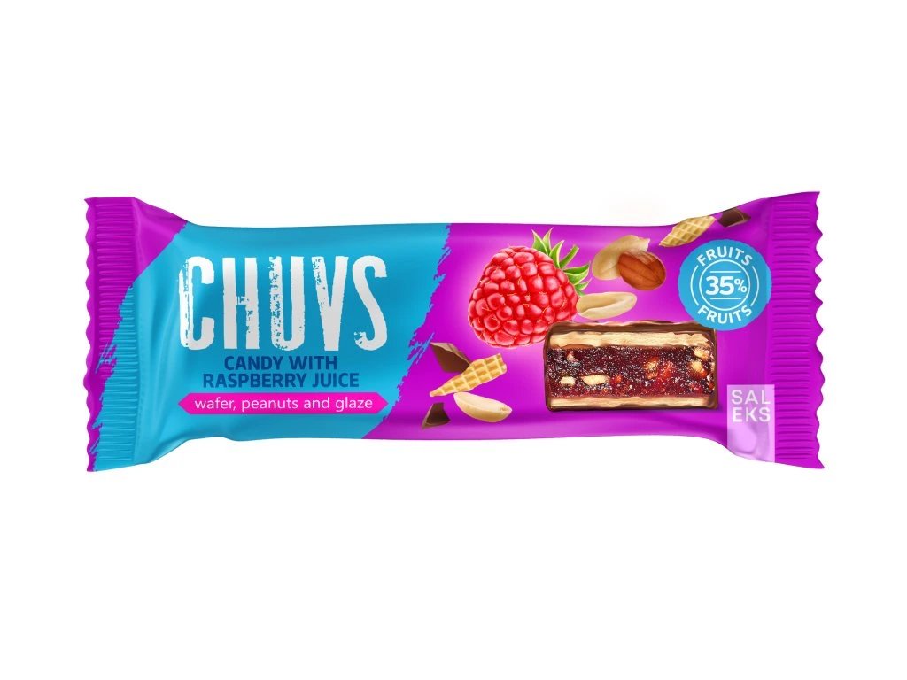 Tyčinka s jablečným pyré, malinovou šťávou a praženými arašídy, celomáčená v kakaové polevě.
