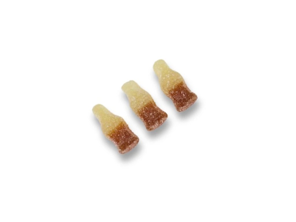Složení: glukózový sirup, cukr, pitná voda, jedlá hovězí želatina, škrob, regulátor kyselosti: (kyselina citrónová, kyselina jablečná), karamelizovaný cukrový sirup, barvivo: kurkumin, aroma: cola.