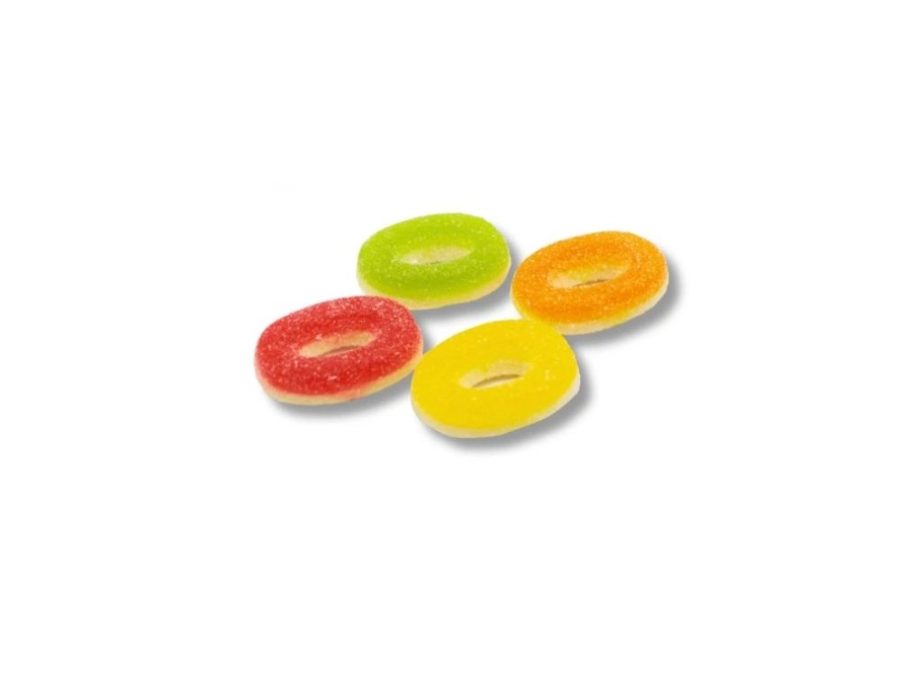 Kyselé želé kroužky, pěnové bonbóny s ovocnými příchutěmi.