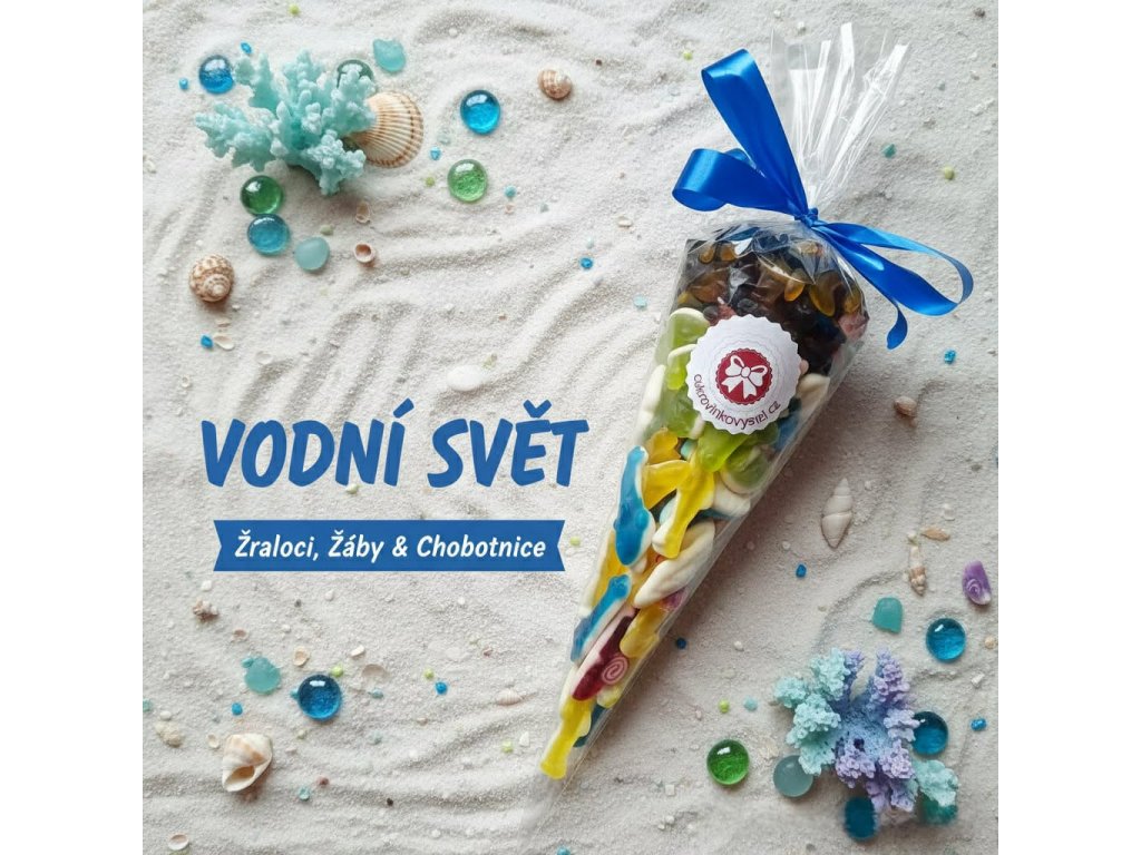 Ponořte se do sladkého světa s naším Kornoutem Vodní svět 400g! 🌊 Tento dárkový kornout je plný želé dobrot: barevné žraloky v modré, žluté a červené barvě, zelené žabky s bílým bříškem a roztomilé chobotnice. Ideální pro milovníky sladkostí, kteří chtějí zažít vodní dobrodružství! 🐙🦈🐸 Vychutnejte si jedinečnou kombinaci chutí a barev, která potěší děti i dospělé.