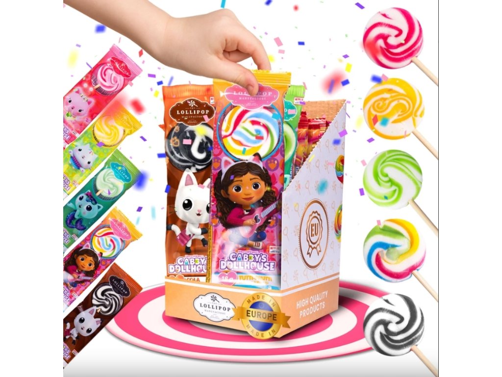 Ovocná lízátka, jednotlivě balená s motivem z pohádky Gábinin kouzelný domek.