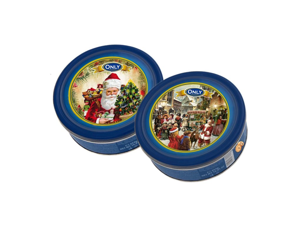 Lahodné sušenky s máslem a čokoládovými lupínky ve znovu použitelném kovovém plechu s "nostalgickým" klasickým vánočním vzorem. V nabídce jsou plechovky s různými vzory.