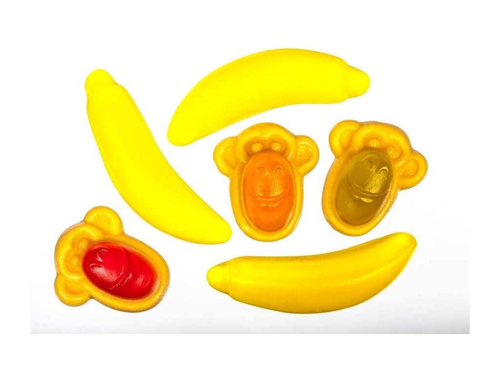 Příjemný mix želatinovo-pěnových bonbonů ve tvaru opiček a banánů obsahuje 5% ovocné šťávy z hroznů, ananasu, pomeranče, mandarinky, guavy, meruňky, manga, marakuji, jablka, papáji a limetky. Základem je samozřejmě oblíbená banánová příchuť. Bonbony jsou vyráběny bez konzervantů a palmového oleje.