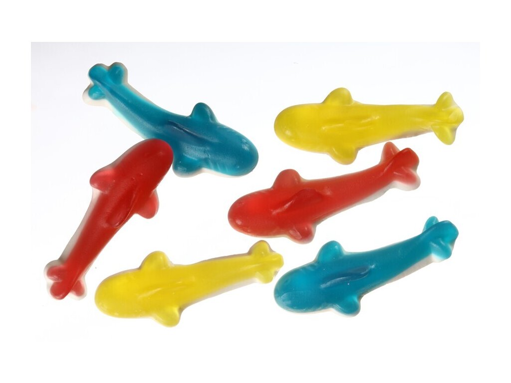 Žraloci ve veselých barvách jsou skvělou volbou pro milovníky želé s pěnou a příchutí maliny, jahody a citrónu.