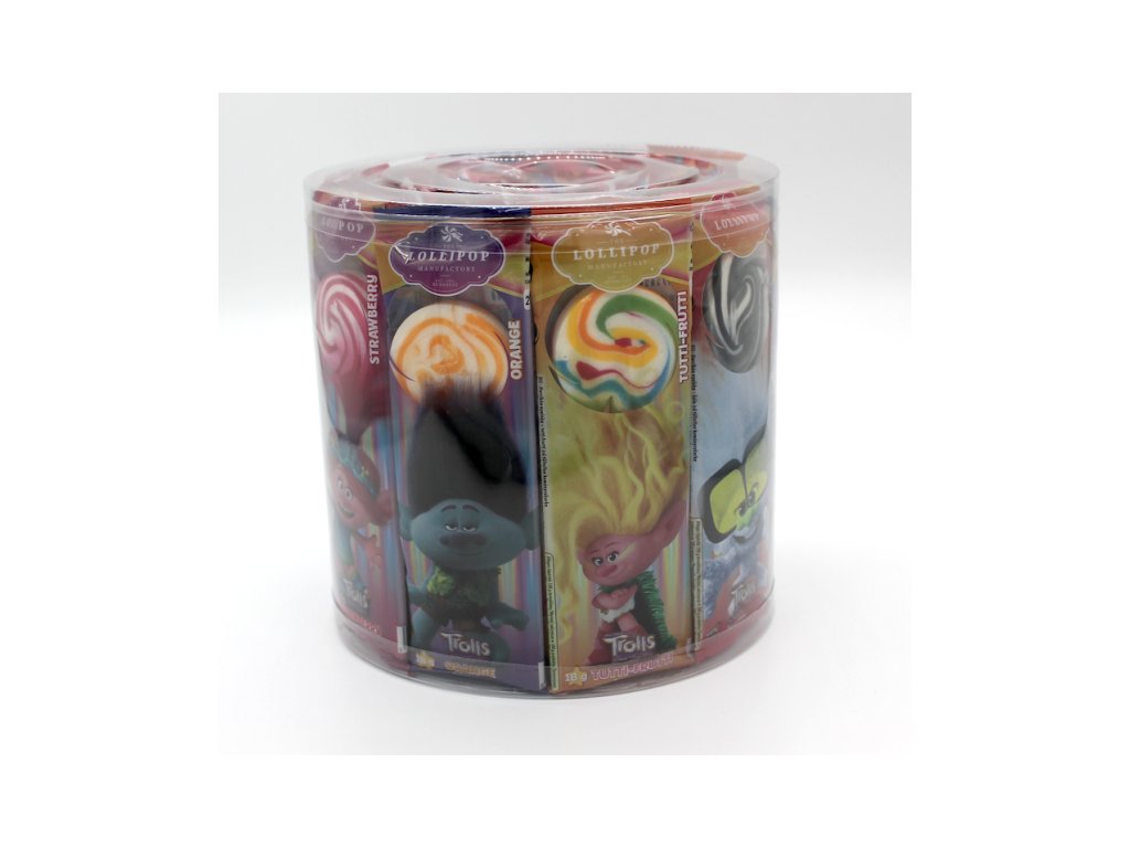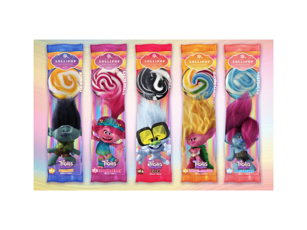 Ovocná lízátka, jednotlivě balená s motivem z pohádky Trolové.
